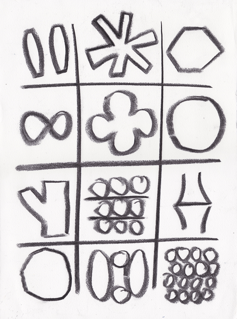 Above: study I, II, III in gouache, studies VI and V in charcoal, VI in pen and ink